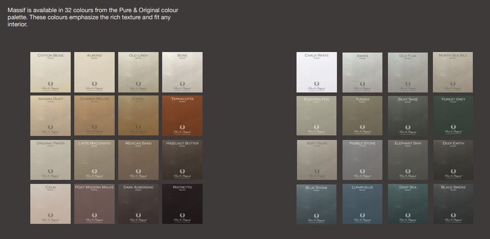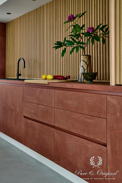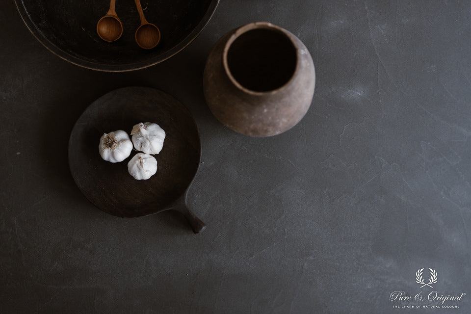 Discover Pure & Original's eco-friendly, micro-stone, textured finish. It offers a luxuriously cement-like architectural (two-coat) textured finish for multiple purposes, such as wet cells, walls, ceilings, kitchen and bathroom countertops, and even, if professionally applied to a suitable substrate, for floors. It’s comparable to microcement finishes but without the cement, which makes it a sustainable alternative. We recommend protection with 1K or 2K Varnish of substrates with high endurance.